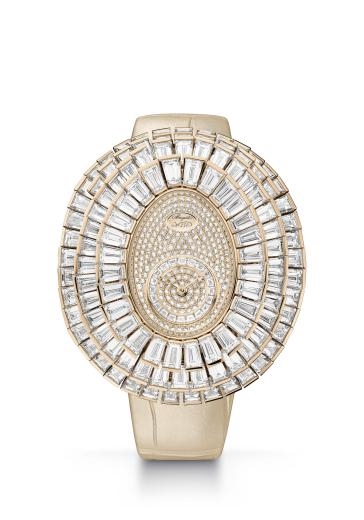 每一枚时计皆为定制,搭配香槟色缎面效果鳄鱼皮表带,其宝玑三重折叠式表扣镶嵌 28颗钻石。Reine de Naples 那不勒斯王后系列 Crazy Flower 腕表共镶嵌 436 颗钻石。